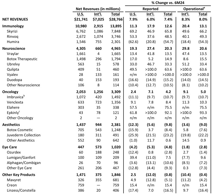 In immunology, IL-23 antibody Skyrizi (risankizumab) and JAK1 inhibitor Rinvoq (upadacitinib) are both growing rapidly, with their sales now surpassing previous top-seller Humira (adalimumab). In the first half of this year, they generated revenues of USD 7.9 billion (+65.8%) and USD 3.8 billion (+48.5%) respectively, totalling USD 11.6 billion. Given the current high double-digit growth momentum, the immunology duo Skyrizi and Rinvoq could easily surpass AbbVie H1 2025 key product sales (USDm)AbbVie H1 2025 key product sales (USDm)AbbVie H1 2025 key product sales (USDm)AbbVie H1 2025 key product sales (USDm)AbbVie H1 2025 key product sales (USDm)AbbVie H1 2025 key product sales (USDm)AbbVie H1 2025 key product sales (USDm)USD 25 billion in total revenue for the full year.