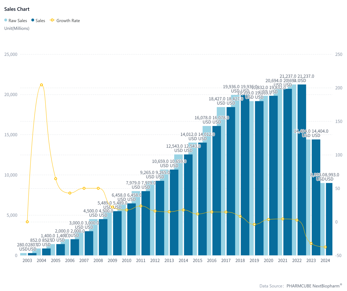 Decline in Humira sales (USDm); Image from PharmCube's NextBiopharm database
