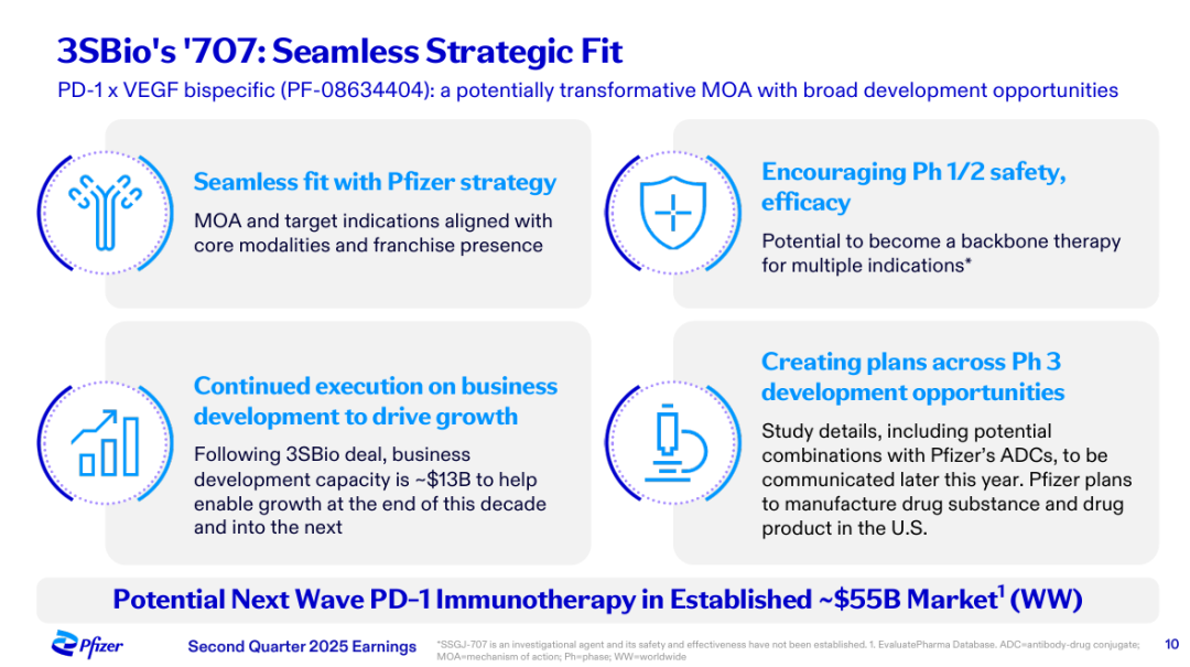 In R&D, Pfizer described 3SBio’s PD 1/VEGF BsAb SSGJ 707 (PF 08634404) as a “seamless strategic fit” and revealed plans for Phase III development, including potential combination regimens with its ADC portfolio. Following the 3SBio deal, Pfizer still has USD 13 billion in business development firepower to fuel sustained growth over the next decade.