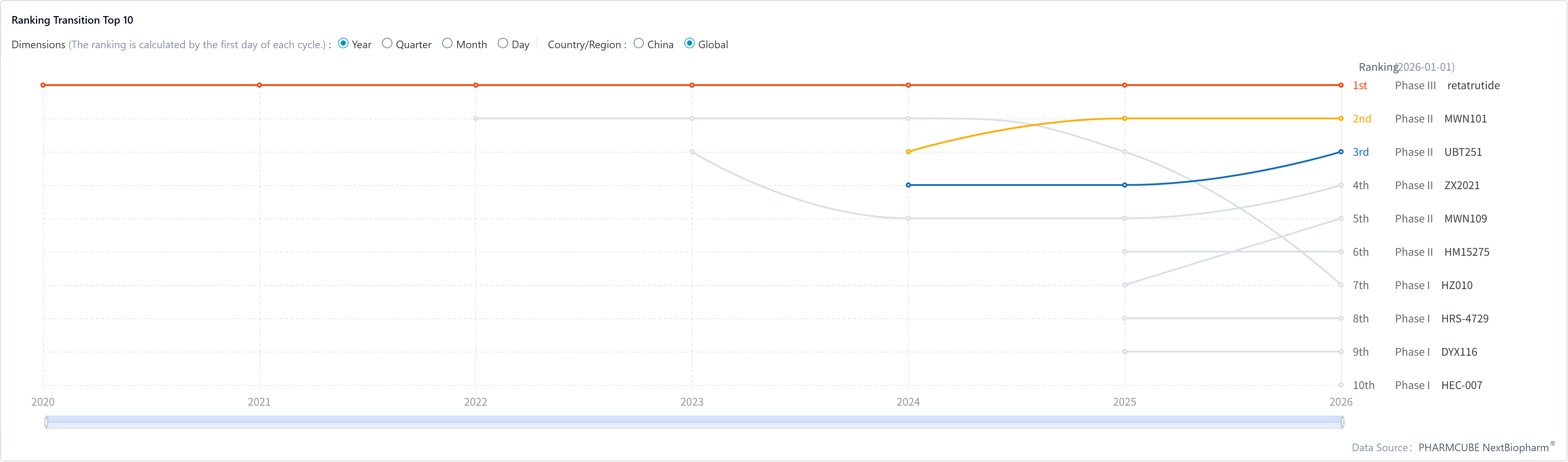 According to PharmCube's NextBiopharm® database, UBT251 ranks third globally in terms of development among GLP-1/GIP/GCGR triple agonists. Click here to request a free trial for NextBiopharm®.