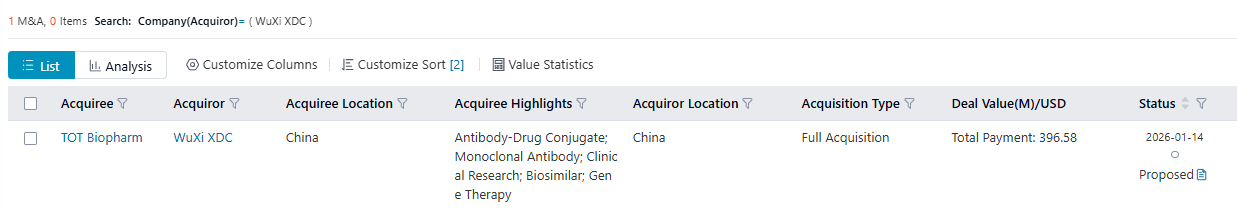 PharmCube's NextBiopharm® database shows that this is Wuxi XDC's first M&A transaction, valued at USD 397 million. Click here to request a free trial for NextBiopharm®.