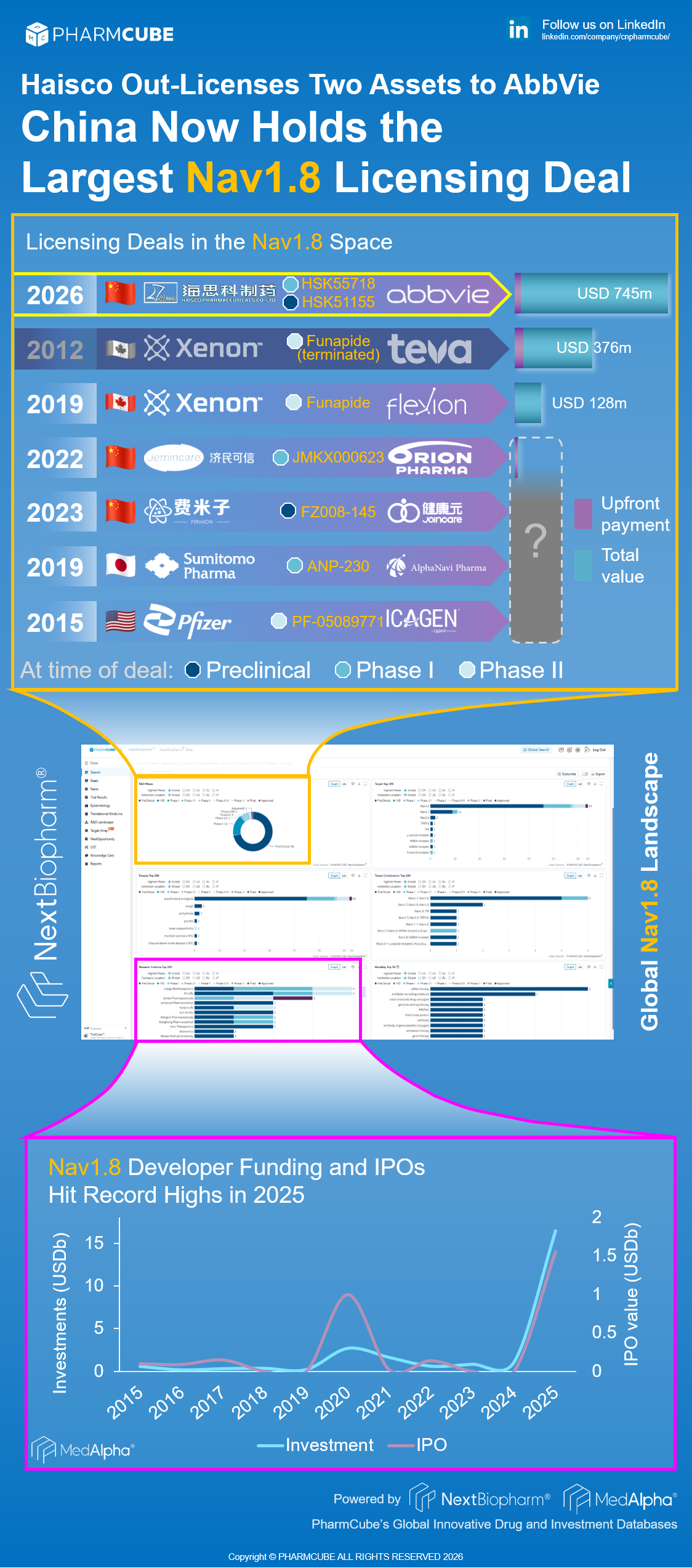 PharmCube's NextBiopharm® database shows that this is the largest licensing deal in the Nav1.8 space. Click here to request a free trial for NextBiopharm®.