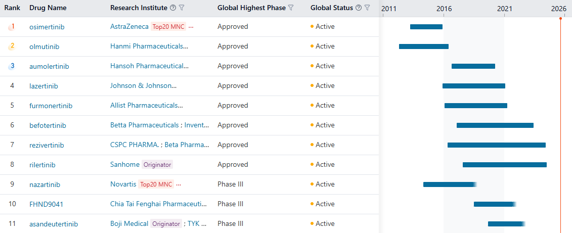 According to PharmCube's NextBiopharm® database, asandeutertinib ranks 11th globally among EGFR T790M inhibitors in terms of development progress. Click here to request a free trial for NextBiopharm®.