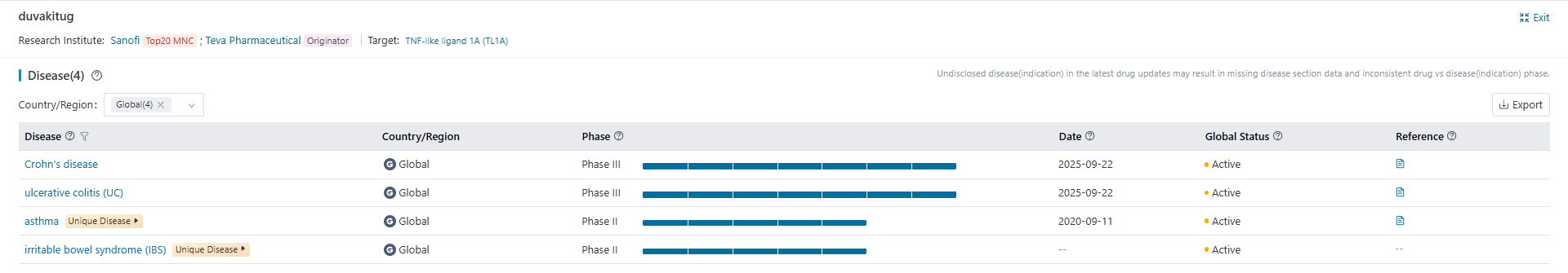 According to PharmCube's NextBiopharm® database, Sanofi is also developing duvakitug in asthma and irritable bowel syndrome. Click here to request a free trial for NextBiopharm®.
