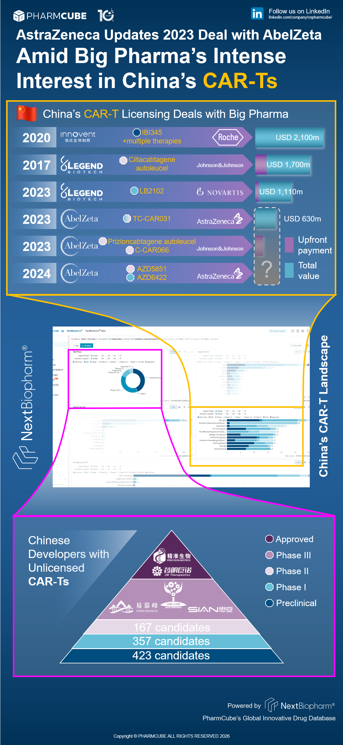 PharmCube's NextBiopharm® database shows that Big Pharma companies have entered into six collaborations with Chinese CAR-T developers. Click here to request a free trial for NextBiopharm®.