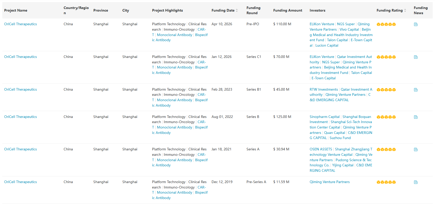 PharmCube's MedAlpha® database shows that OriCell closed five previous funding rounds, totalling USD 392.53m in funds raised so far. Click here to request a free trial for MedAlpha®.