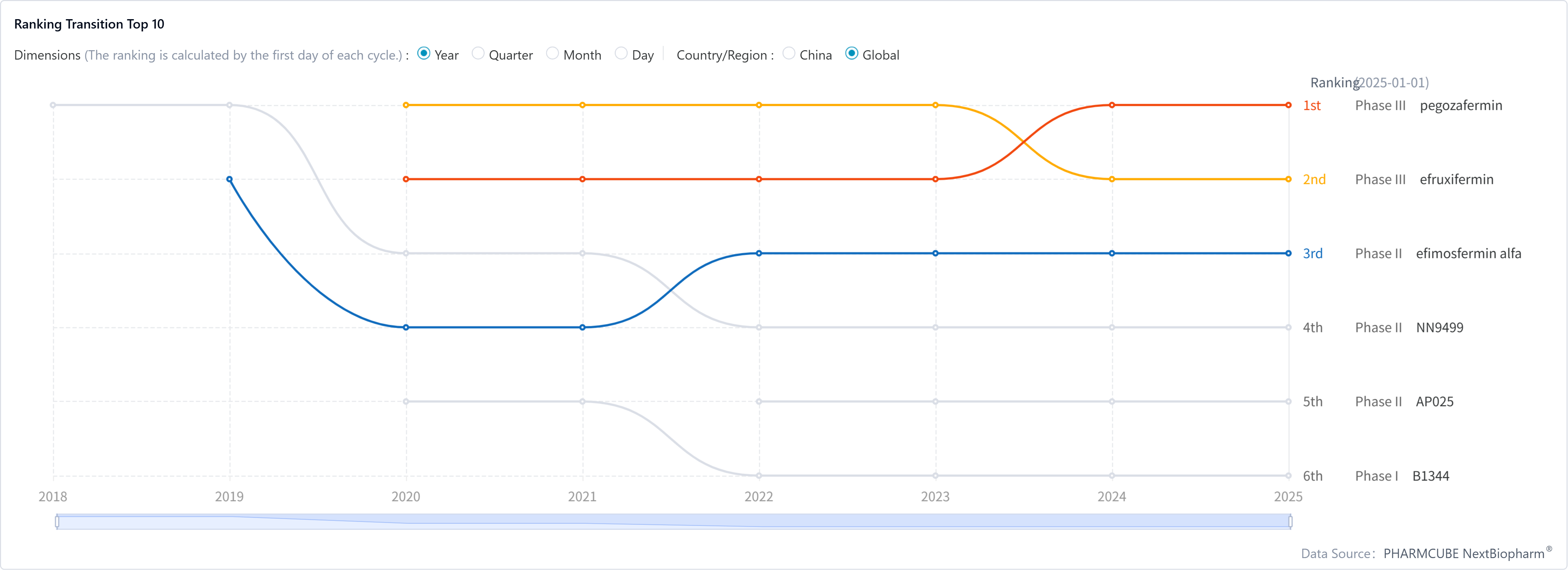 According to PharmCube's NextBiopharm® database, efruxifermin was leading the FGF21 analogue pack until Roche's pegozafermin beat it to late-stage in 2023. Click here to request a free trial for NextBiopharm®.