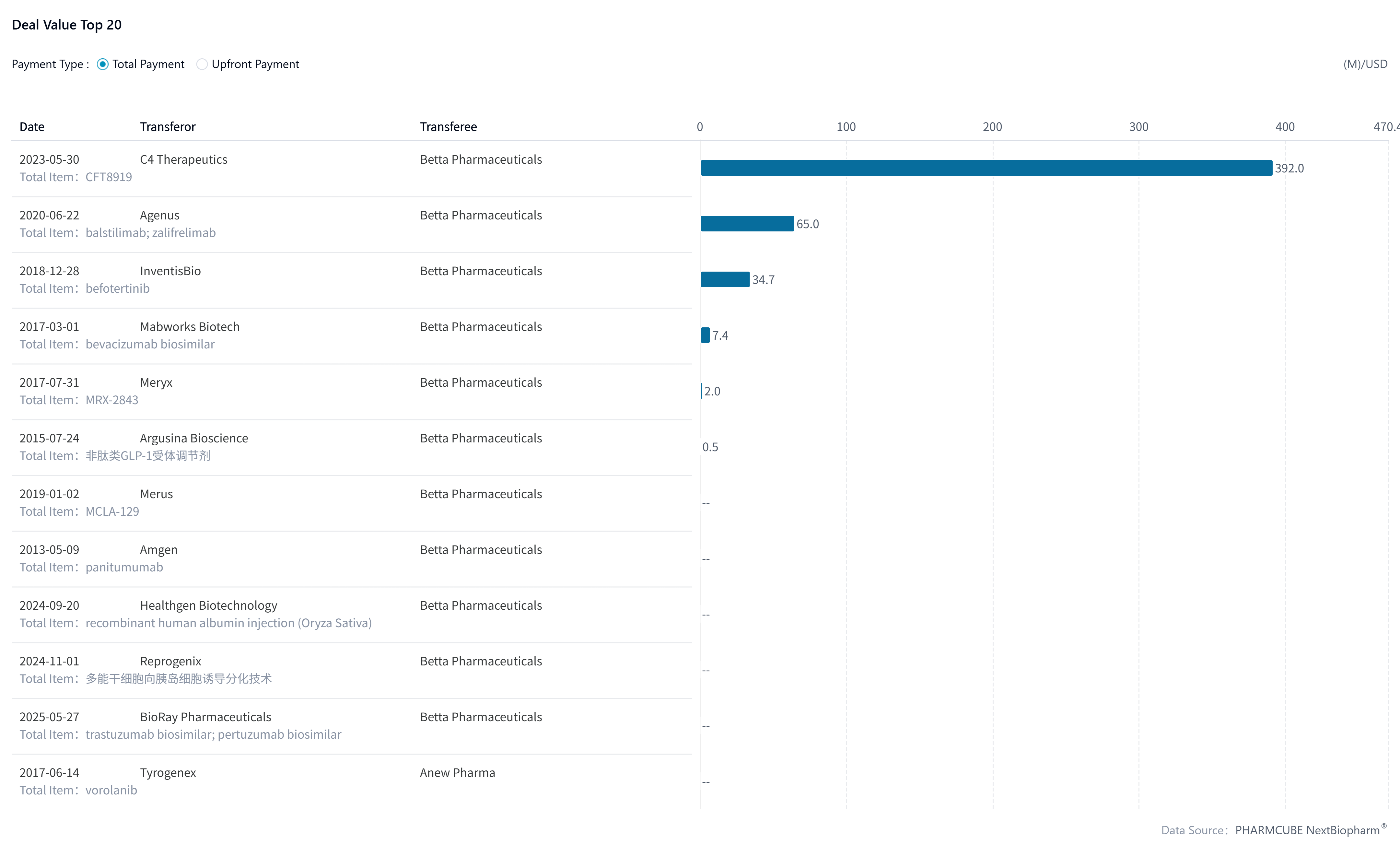 According to PharmCube's NextBiopharm® database, Betta has entered a total 12 in-licensing deals so far. Click here to request a free trial for NextBiopharm®.
