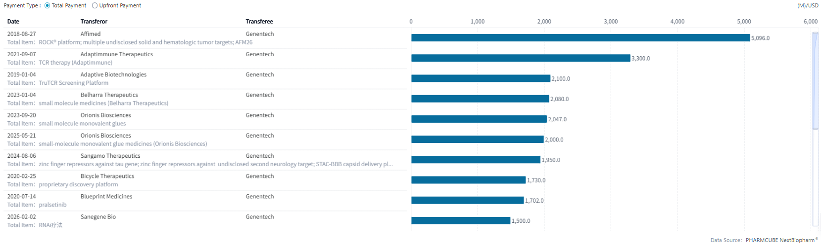 According to PharmCube's NextBiopharm® database, this marks Genentech's 10th-largest deal. Click here to request a free trial for NextBiopharm®.