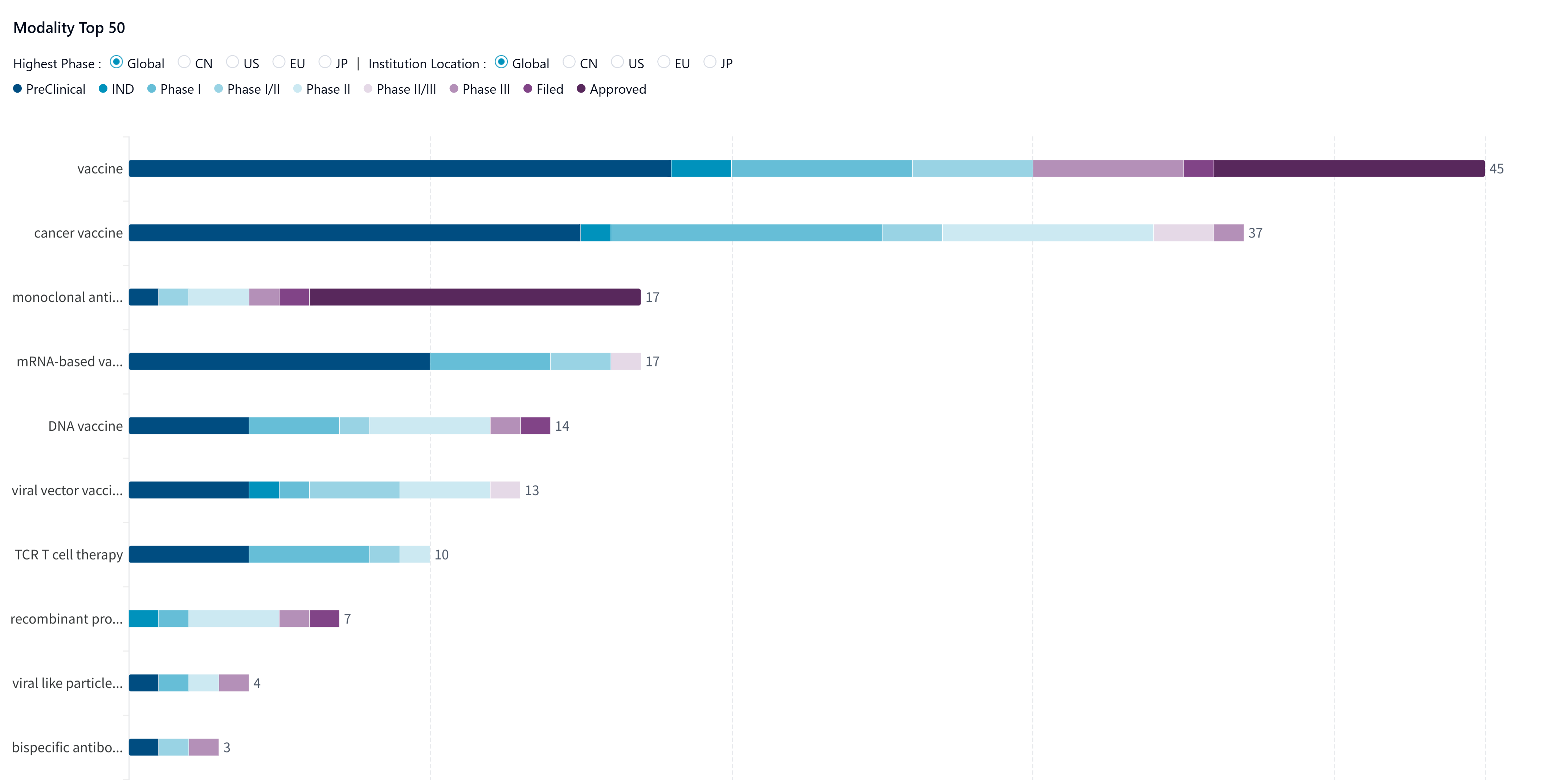 PharmCube's NextBiopharm® database reveals that vaccines are the most sought-after modality against HPV among dozens of strategies currently under research (top 10 shown below). Click here to request a free trial for NextBiopharm®.