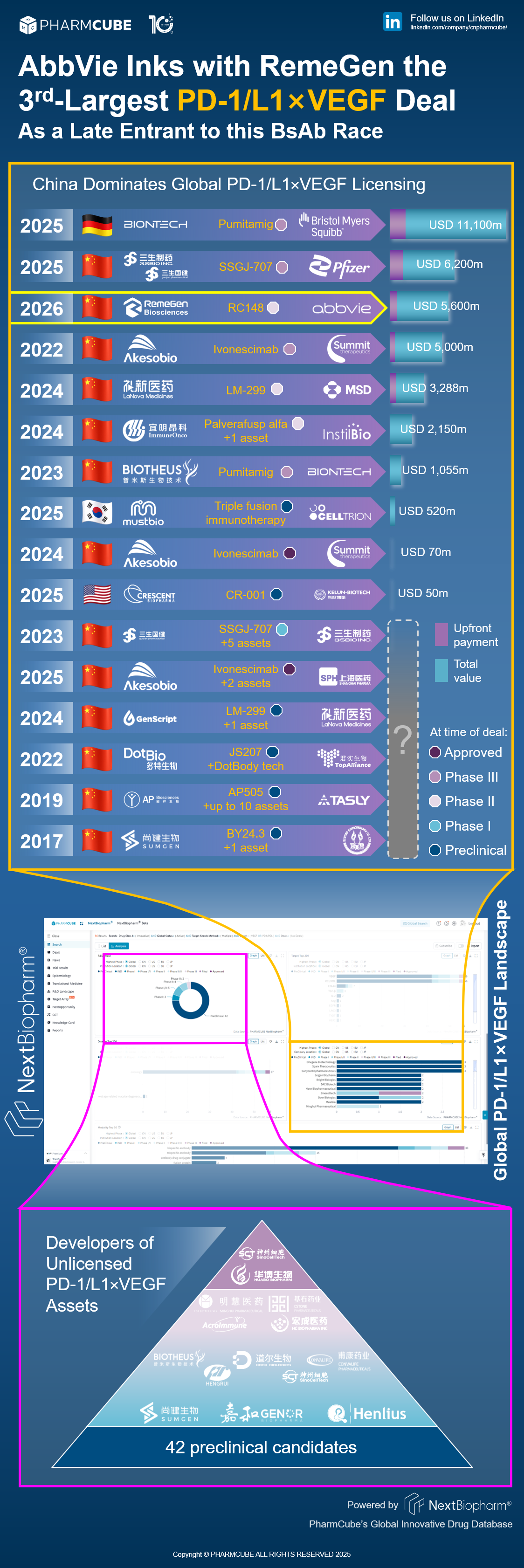 PharmCube's NextBiopharm® database shows that this is the third-largest deal in the PD1×VEGF BsAb space, which is dominated by China. Click here to request a free trial for NextBiopharm®.
