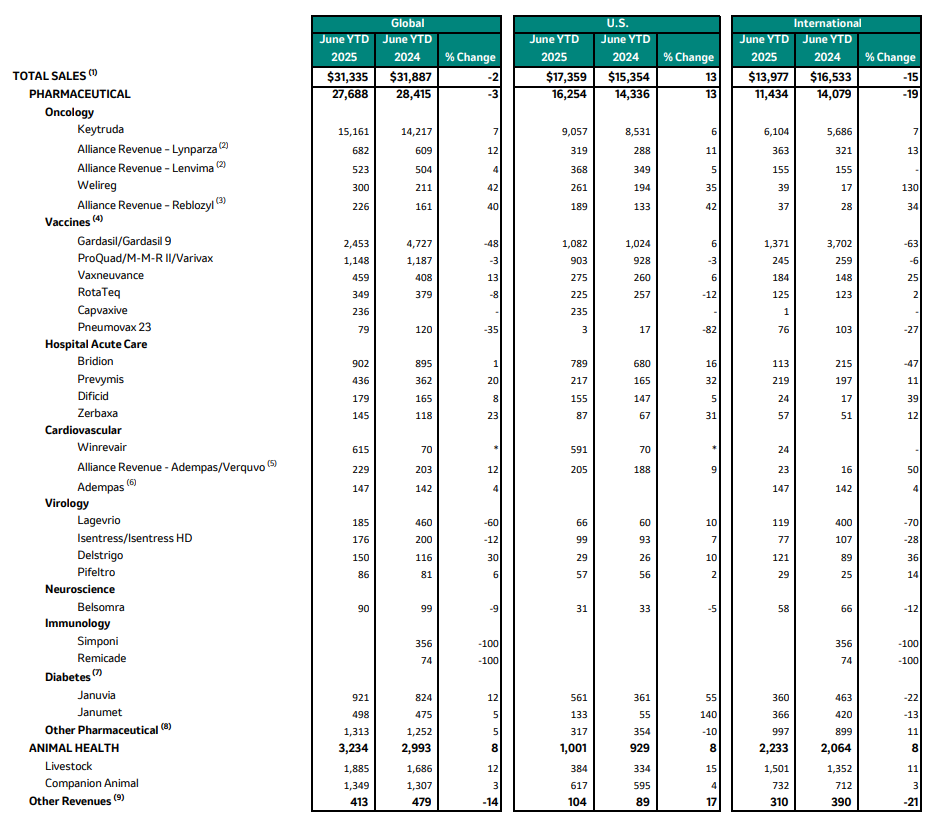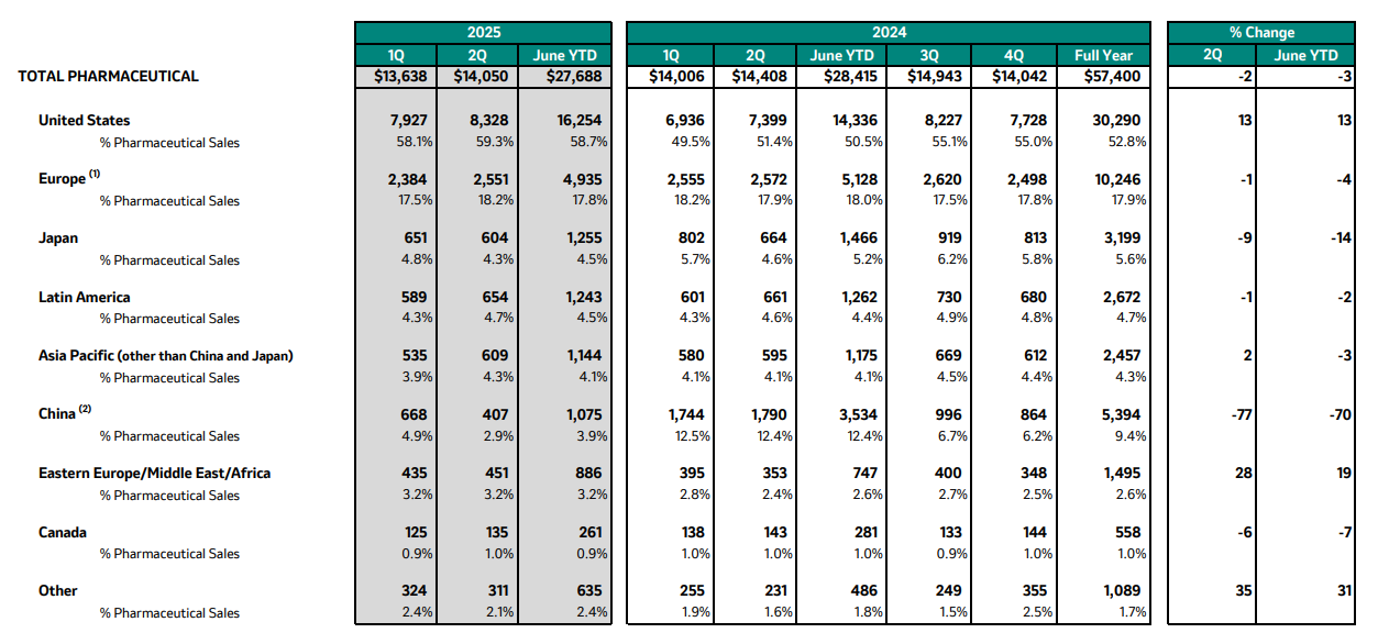 On 29 July, MSD announced its H1 2025 results, with total revenue of USD 31.3 billion, down 2% year on year (YoY). MSD’s pharmaceutical business sales were USD 27.7 billion, down 3%, while revenue from China fell 70% to USD 1.075 billion, accounting for 3.9% of MSD’s global pharmaceutical business.