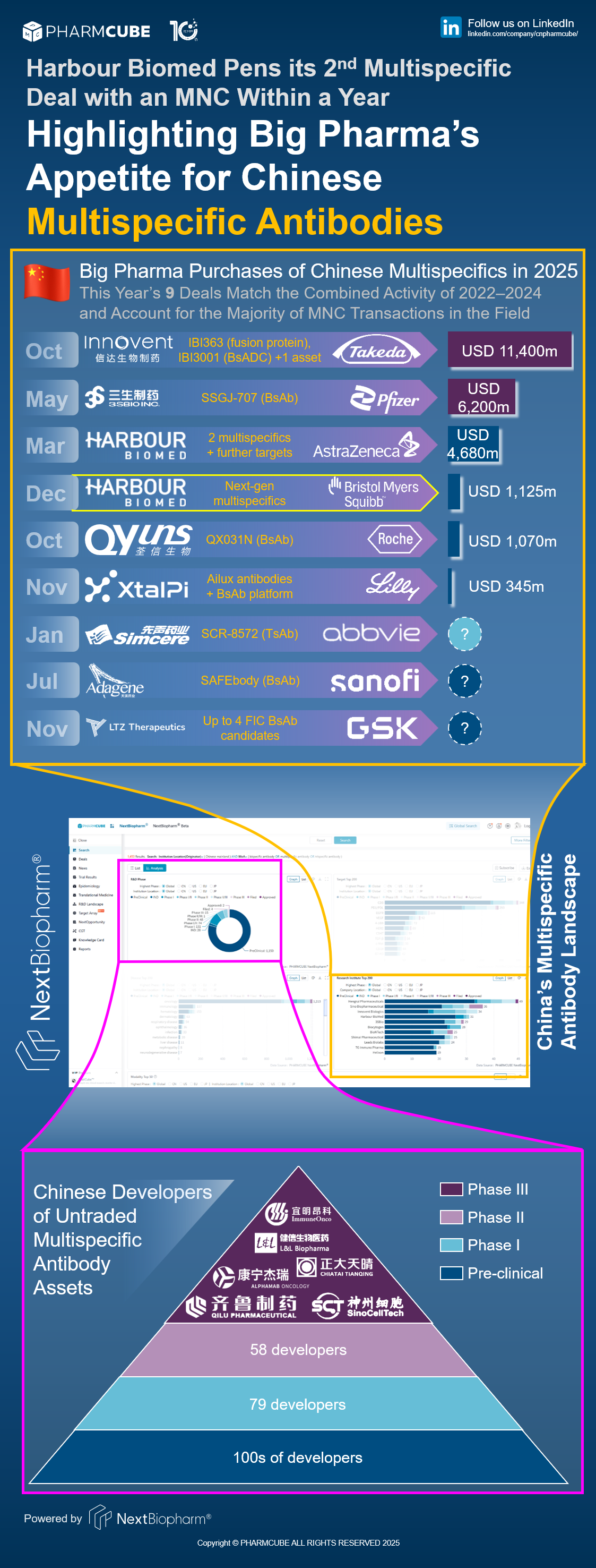 PharmCube's NextBiopharm® database shows that Big Pharma acquisitions of China-developed multispecifics have accelerated this year. Click here to request a free trial for NextBiopharm®.