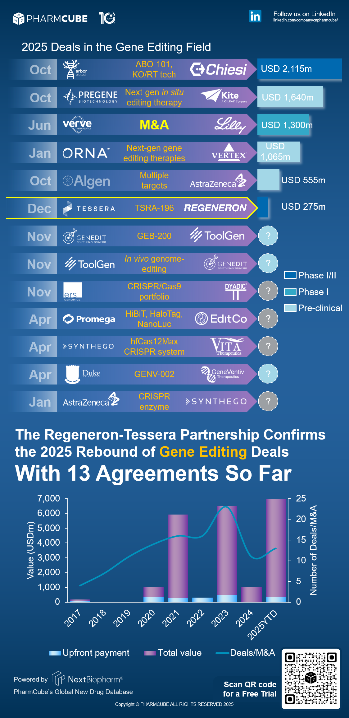 PharmCube's NextBiopharm® database shows that the deal marks the 2025 recovery of deal-making activity in the gene editing sector. Click here to request a free trial for NextBiopharm®.
