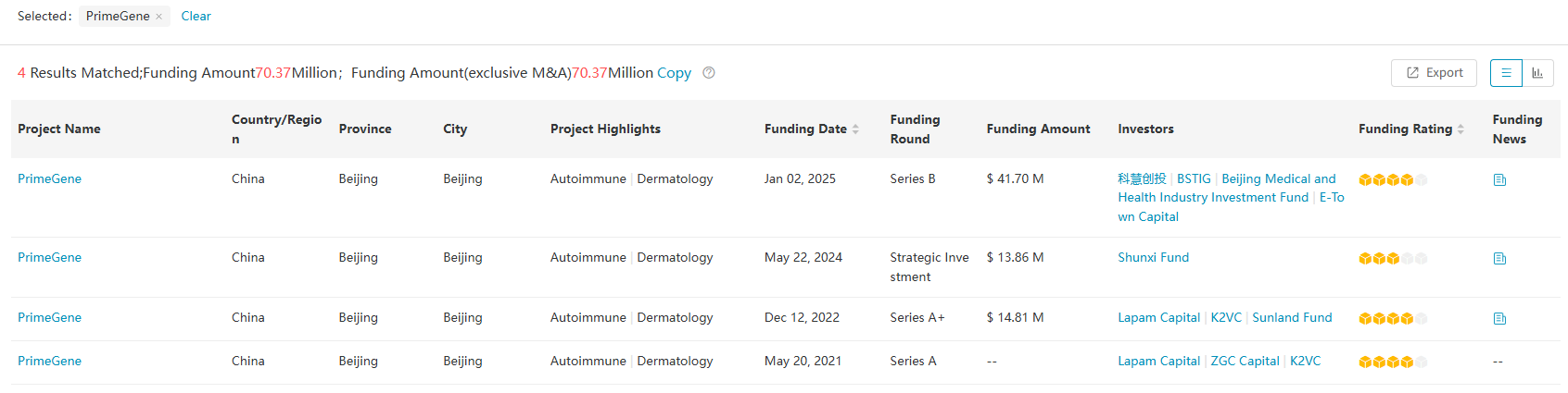 According to PharmCube's MedAlpha® database, PrimeGene has raised over USD 70 million in four pre-IPO funding rounds. Click here to request a free trial for MedAlpha®.