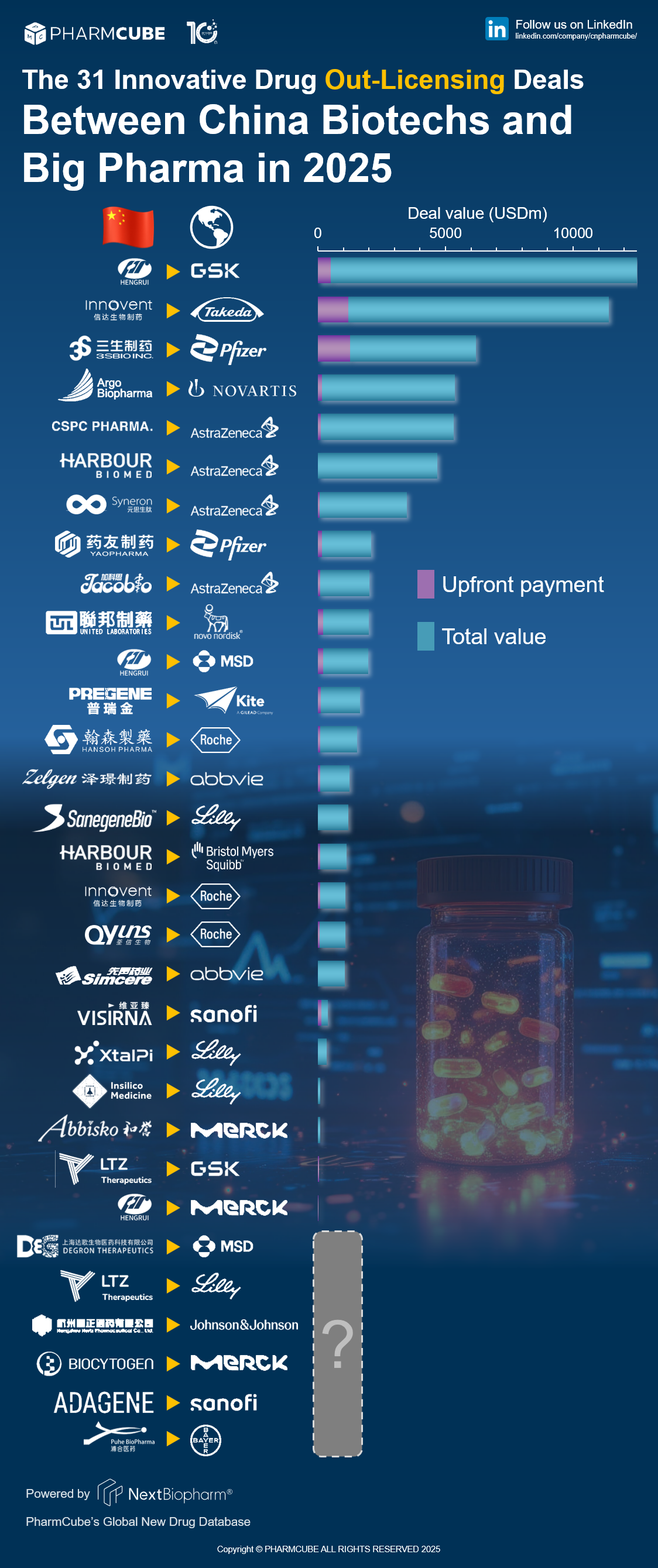 According to PharmCube's NextBiopharm® database, this marked the last of the 31 out-licensing deals between Chinese biotechs and Big Pharma companies. Click here to request a free trial for NextBiopharm®.