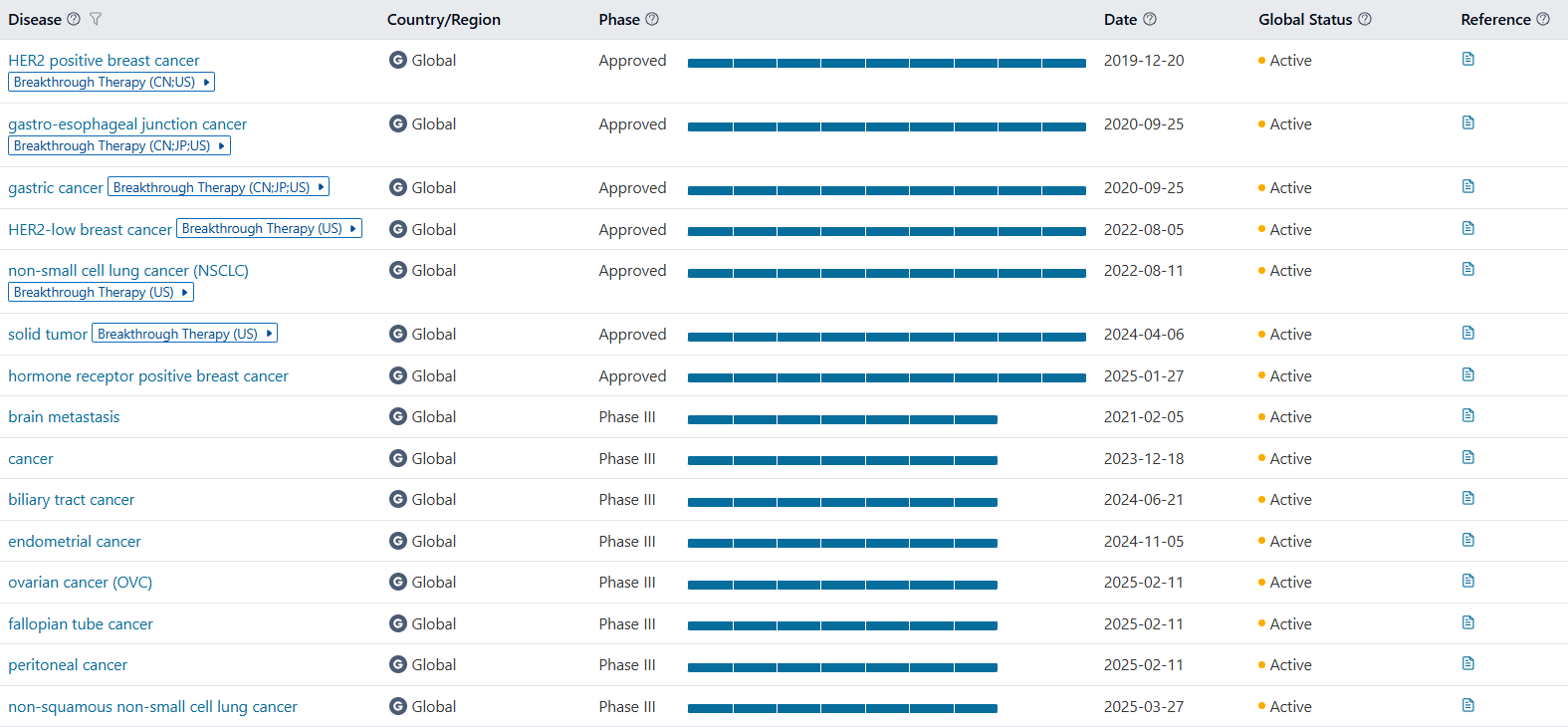 According to PharmCube's NextBiopharm® database, Enhertu has entered development in 57 indications, including seven approved and eight in Phase III. Click here to request a free trial for NextBiopharm®.