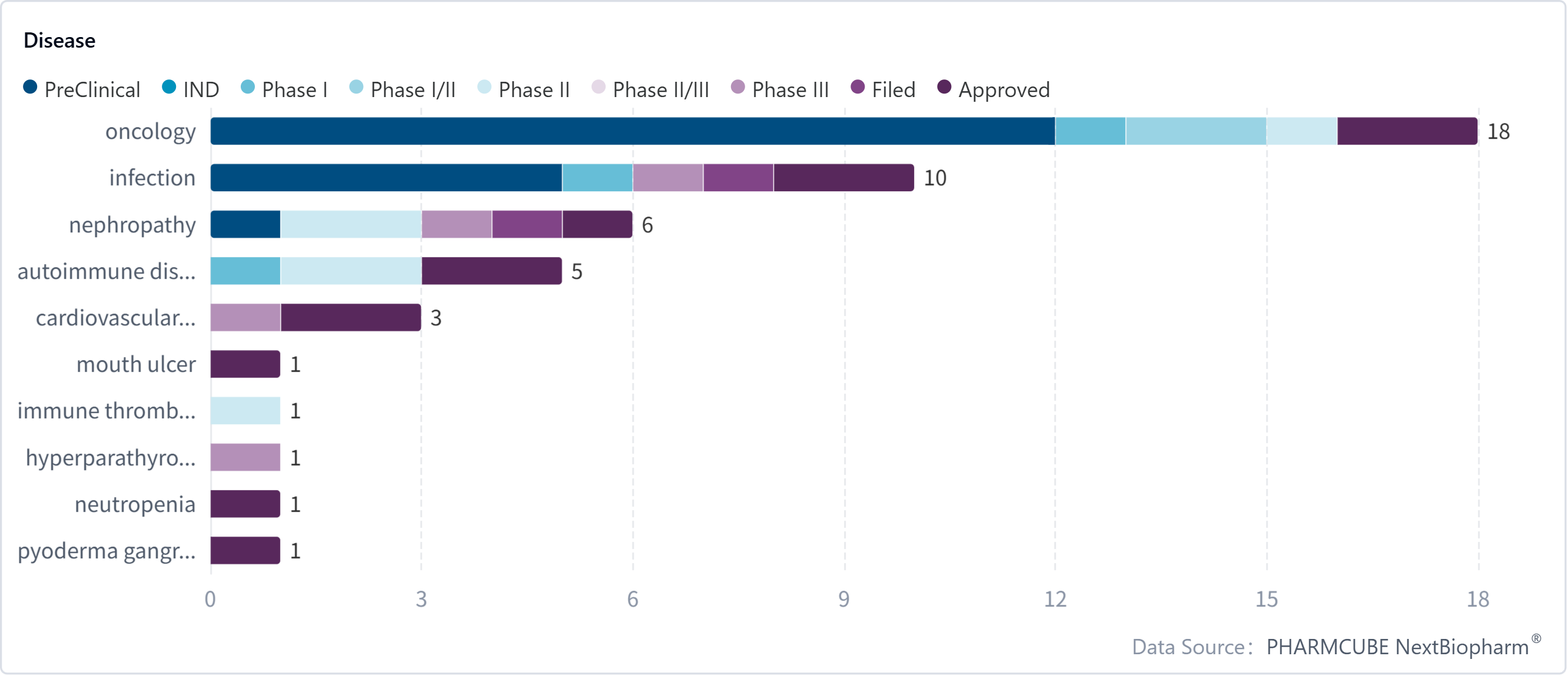 PharmCube's NextBiopharm® database shows that Everest's pipeline focuses on oncology. Click here to request a free trial for NextBiopharm®.